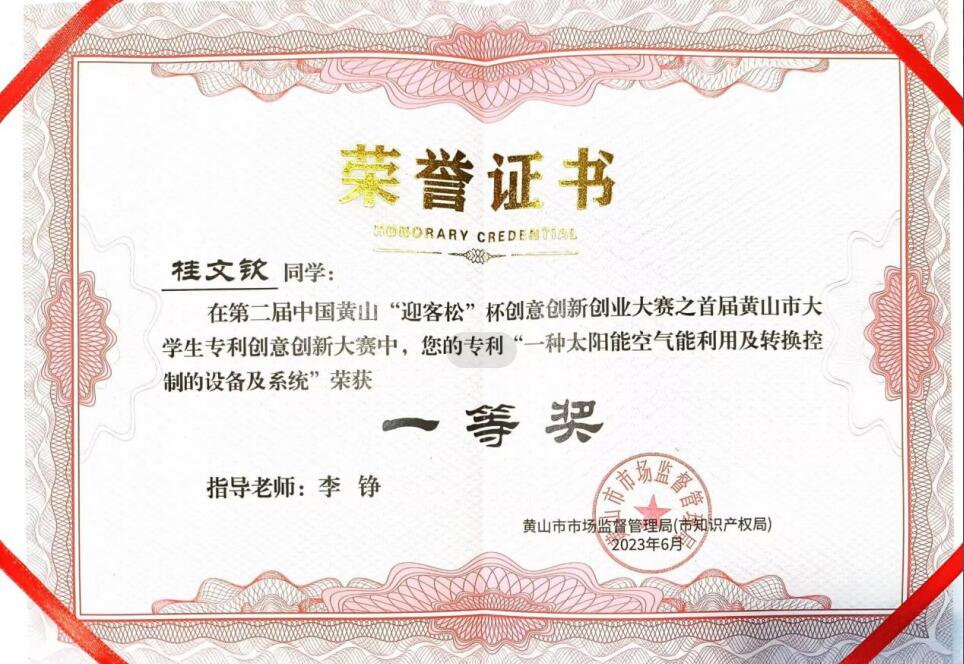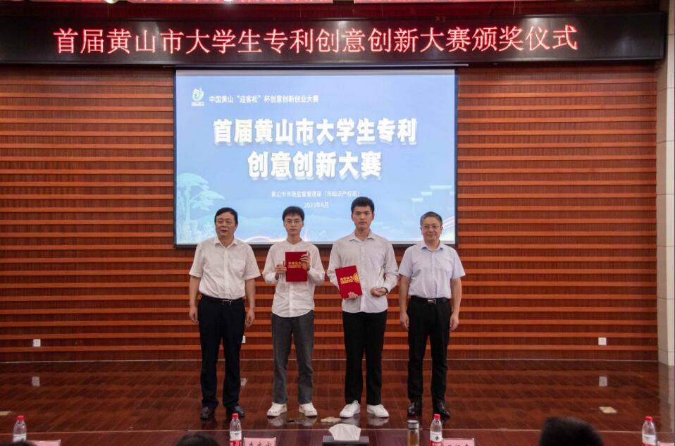 本次首届“迎客松”杯黄山市大学生专利创意创新大赛于6月16日下午进行了决赛,共评选出一等奖2名,二等奖3名,三等奖5名及优秀奖10名。我院20机械设计制造及其自动化2班学生桂文钦创作的国际发明专利获得第一名的好成绩,李庆宏、王恒来为桂文钦颁奖。